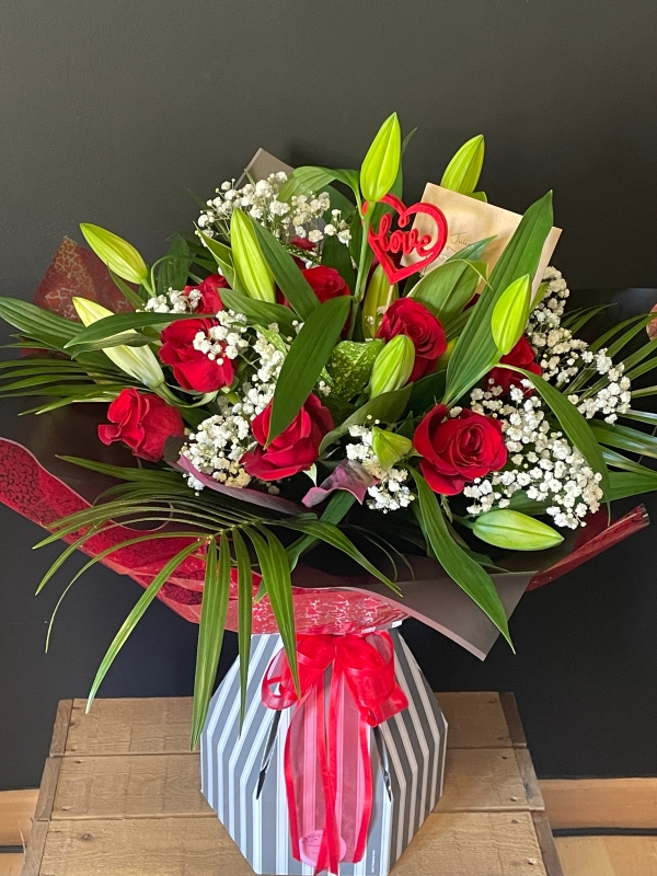 a beautiful mix of lillies and roses hand tied in water with a mixture of greenery