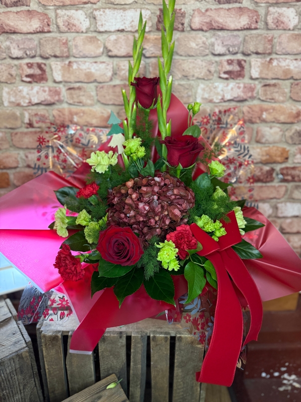A stunning mix of reds and greens make up this beautiful Mulled Wine contemporary front facing design, including luxury red roses