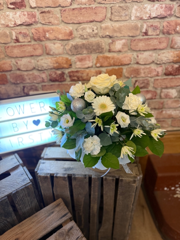 A beautiful arrangement of a mixture of white flowers in this Christmas hat box design, includes baubles and a Christmas pick with a Christmas themed cellophane and box.